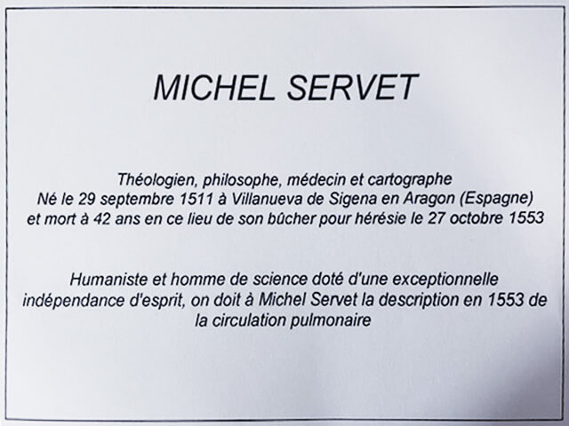 Cette plaque, posée sur le podium d’une statue de l’humaniste aragonais déjà inaugurée en 2011, située près du lieu où il fut exécuté en 1553, rétablit enfin l’exactitude de ses origines – Villanueva de Sigena – longtemps mal comprises en Suisse.